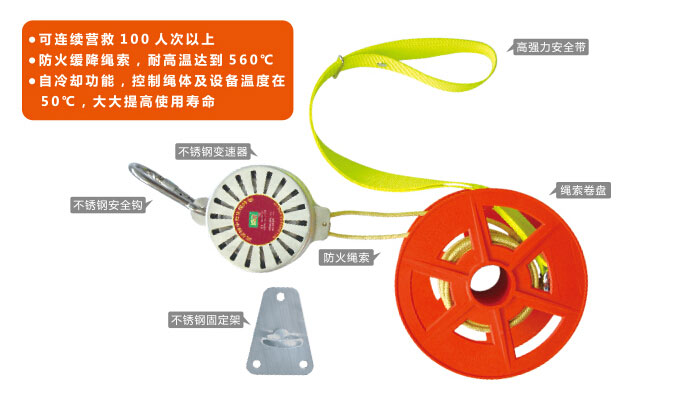 緩降器由掛鉤(或吊環)、吊帶、繩索及速度控制等組成,是一種可使人沿(隨)繩(帶)緩慢下降的安全營救裝置。它可用專用安裝器具安裝在建筑物窗口、陽臺或樓房平頂等處,營救處于高層建筑物火場上的受難人員。