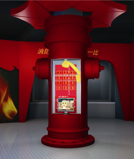 119模擬報警設備展示方式: 利用真實電話與多媒體結合的方式模擬展示,觀眾參與互動。觀眾拿起聽筒用手撥打救援電話(119120110),顯示屏播放相應的多媒體播放場景,逼真的展示緊急呼救正確的方式方法。