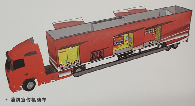 多功能消防宣傳車采用電動車輛底盤改裝,車身長12米,寬2.5米,高3.5米。整體車身以大紅色為背景色,噴繪有消防人物卡通漫畫、消防標識等圖文,色彩鮮艷奪目,具有很強的吸引力。車內張貼有消防安全常識、常見消防標識、家庭消防五件寶、三懂三會、疏散指示標志等內容,生動活潑、通俗易懂。
